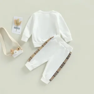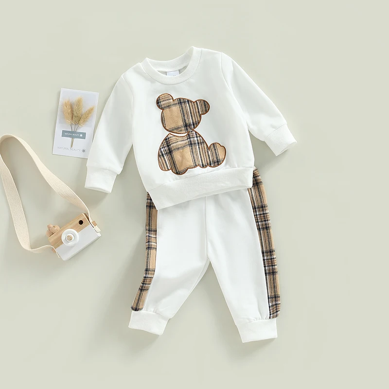 Newborn Baby 2Pcs Fall Outfits, Long Sleeve Plaid Bear Pattern Pullover Tops and Pants Set