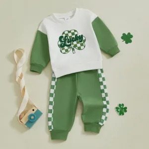 Boy Irish Day Outfit Sets Long Sleeve Clover Letter Print Tops Drawstring Pants Sets