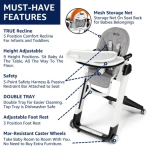 Compact Size: The foldable baby high chair is only 23″ L x 4″ W x 29″ H when folded, the light weight of 10 pounds and the compact size are not only easy to carry, but also fit in any corner of the home.