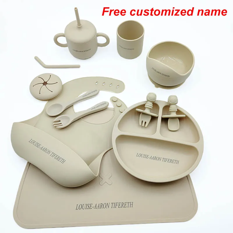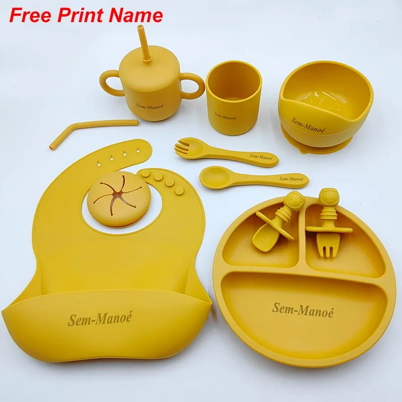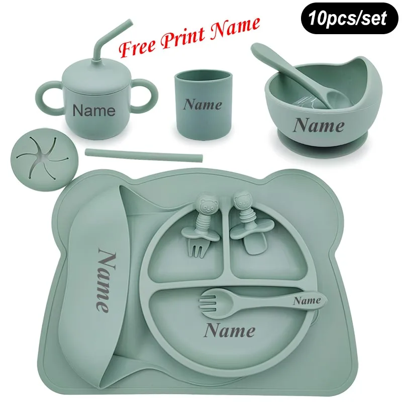 Silicone Baby Feeding Set 10 Pcs Children’s Tableware Set Personalized Name Plates Bowls Placemats Spoon Fork For Kids Newborn Gift BPA Free Shipping