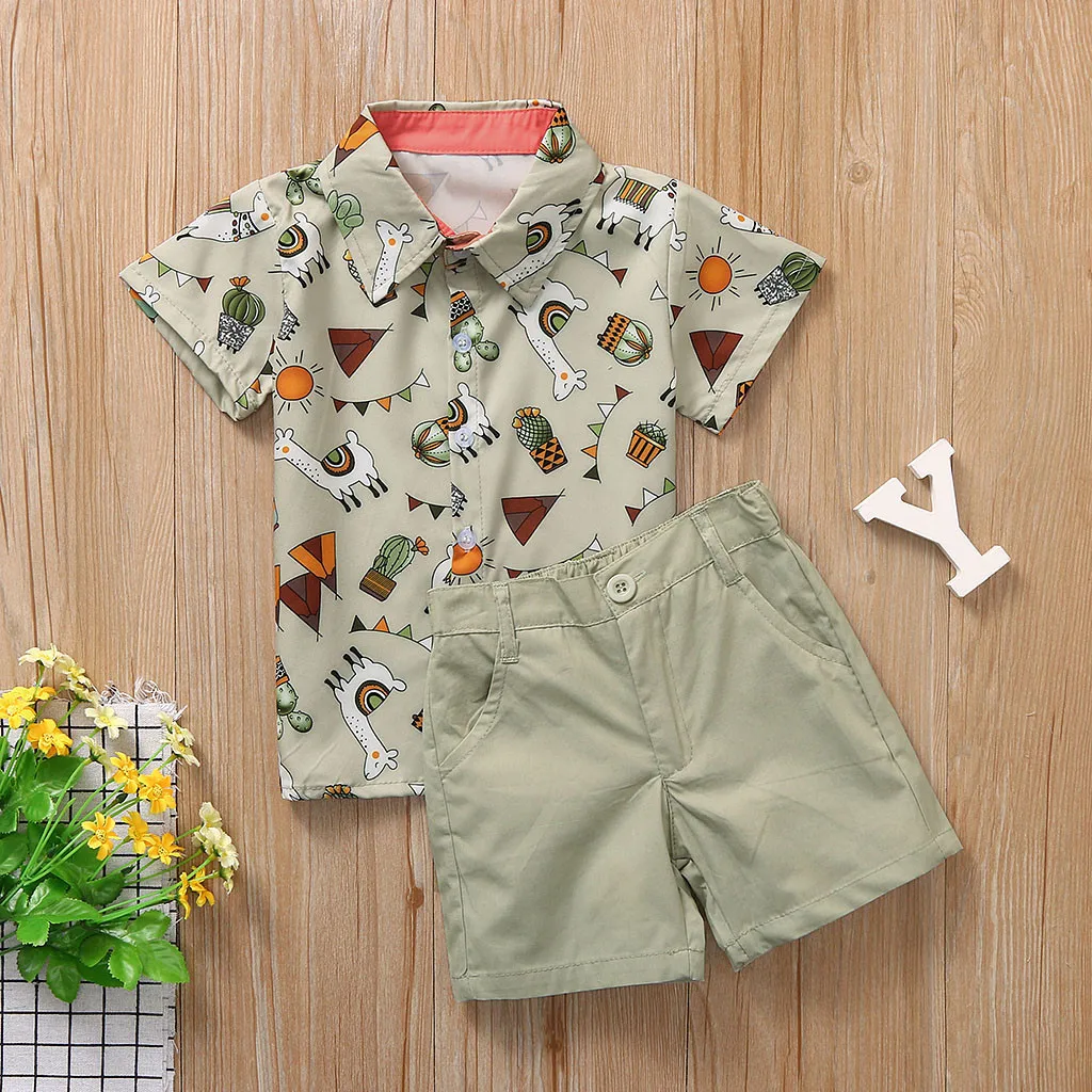Toddler Baby Boys Gentleman Cartoon Alpaca Print T-Shirt Tops+Shorts Outfits